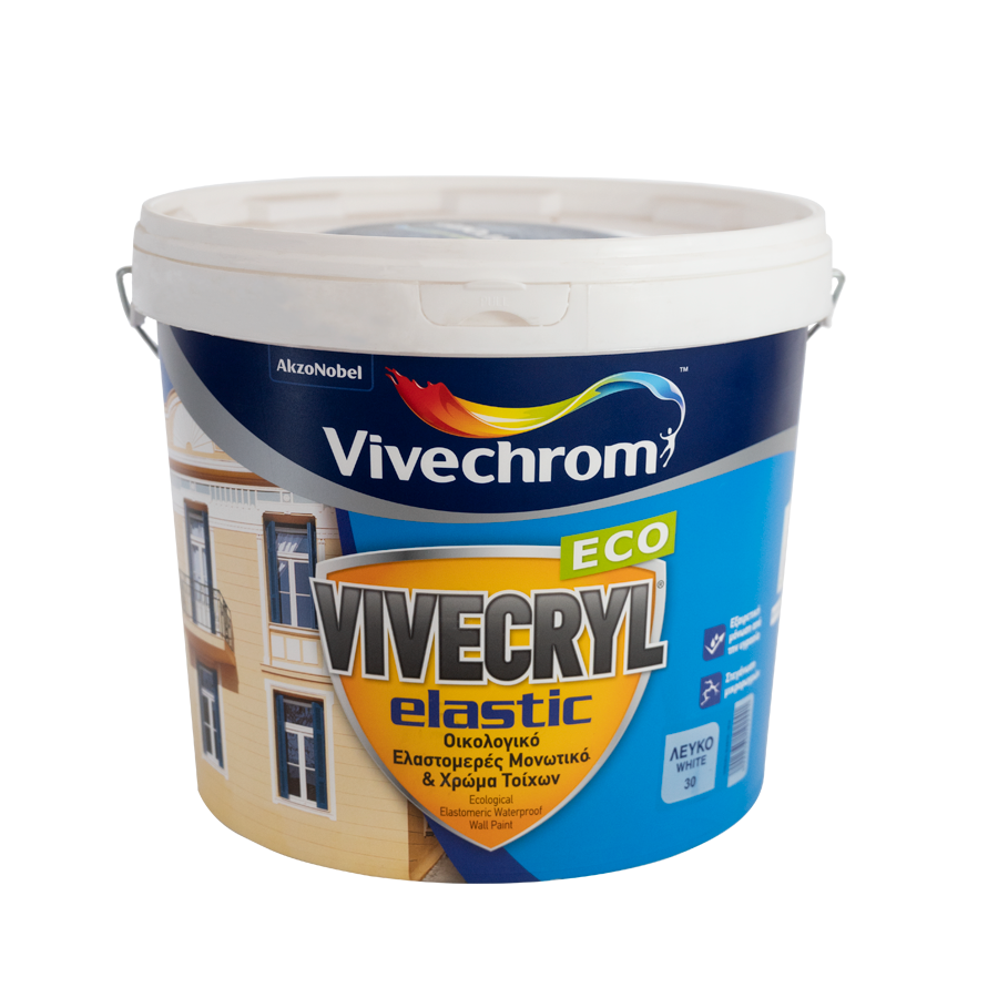 VIVECRYL ELASTIC ECO is an elastomeric insulating paint that perfectly waterproofs the exterior walls from humidity. It covers completely all the existing hairlines and small cracks and exhibits remarkable resistance to the expansions and contractions of the surface, retaining its elasticity between – 20°C to 80°C. It is suitable for every kind of new or old surface, forming a watertight and extremely durable elastic film. It offers a magnificent matt surface and its shades remain fadeless for many years. VIVECRYL ELASTIC ECO is a certified cool paint characterized by high solar reflectance value (SR), high infrared emittance (ε) and high reflectance index value (SRI).